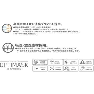 水との化学反応で熱を奪う特性があるキシリトール・エリスリトールの特殊冷感プリントと消臭イオンプリントを内側に施しているため、汗や湿気を利用してマスク生地の温度を下げ、嫌な臭いを消臭します。