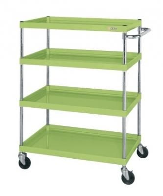 堅牢・安全・美観 三拍子揃った新しいワゴンです。 人にやさしい棚板形状です。●外寸:W900×D600×H1200mm●カラー:サカエグリーン●均等耐荷重:200kg●質量:43kg●キャスター:100φゴム車
